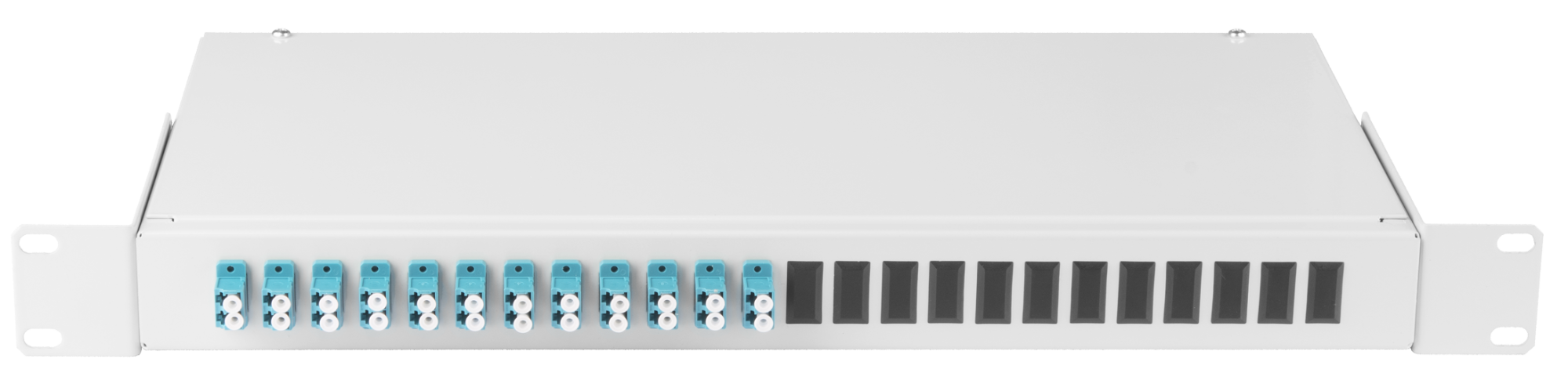 Кросс 24LCU оптический стоечный 19" 1U NMF-RP24SC-TS-P1-1U-GY 1х24, комплект: 24LC SM UPC адаптеры, пиги, гильзы, чёрный, NikoMax Premium Line