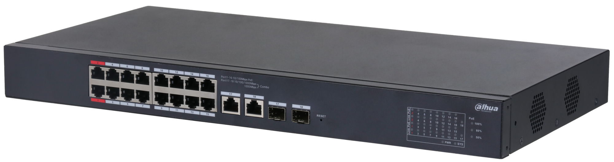 Коммутатор 16х10/100PoE190Вт +2хC L2 Dahua